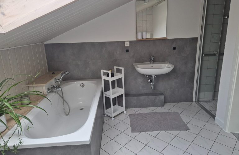 Das Bad erreichen Sie am Schlafzimmer es verfügt über 1 Toilette, 1 Waschbecken, 1 Badewanne und eine Separate Dusche.