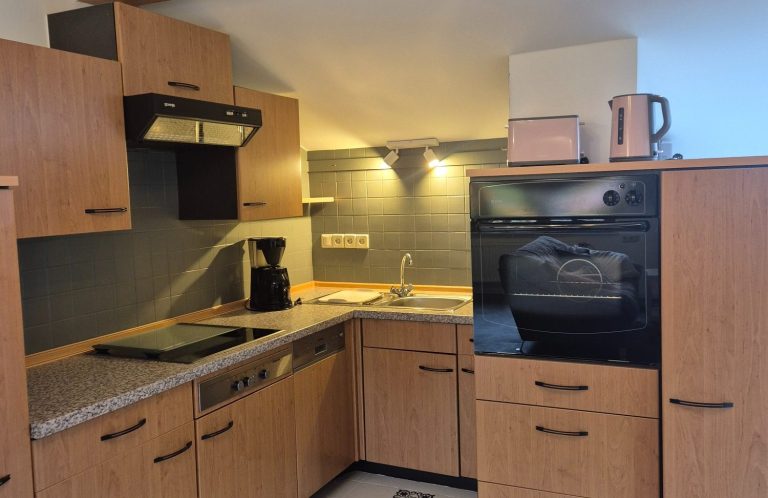 Die Küche ist ausgestattet mit einer Spülmaschine, Herdplatte, Backofen, Spülbecken, Toaster, Wasserkocher und Filterkaffeemaschine.