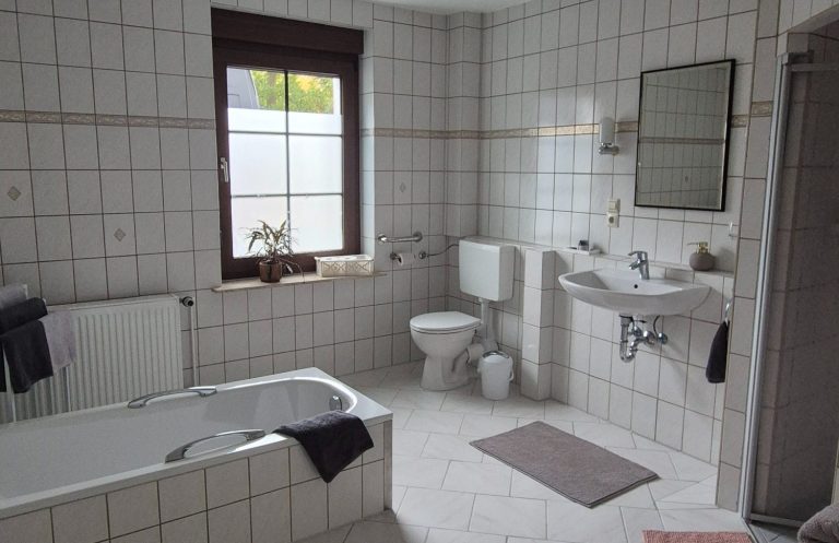Das Badezimmer verfügt über 1 Waschbecken, 1 Toilette, 1 Badewanne und eine separate Dusche. Haltegriffe und ausreichend Platz auch für Menschen mit Behinderung. Handtücher sind inklusive.