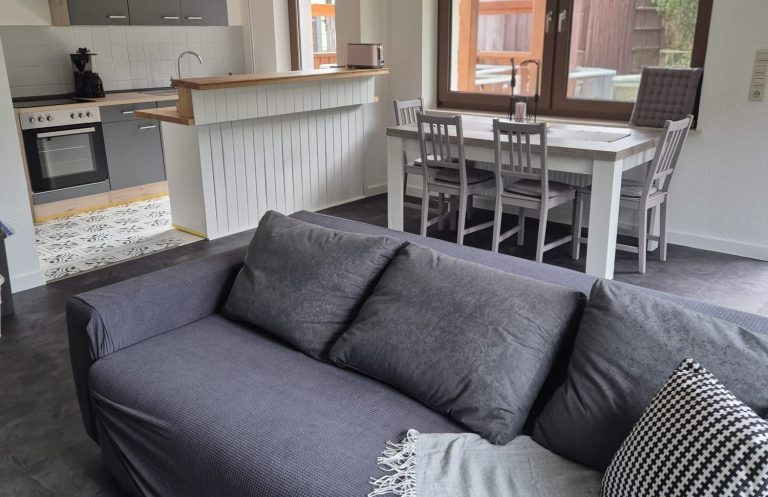 Das Wohnzimmer ist mit einer offenen Küche, Essbereich und einer gemütlichen Schlafcouch ausgestattet. Sat TV und gratis W-Lan läd zum verweilen ein.